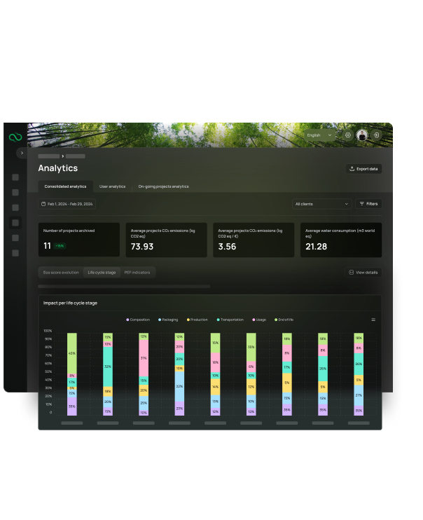 Track, analyze and manage your company's impact data using scalable LCAs aligned with ISO 14040/44 in order to identify areas of improvement and to meet sustainability targets across products and business activites. From product LCA to corporate sustainability, centralize and report results with the ability to deliver environmental impact and actionable insights in the hands of your decision makers.