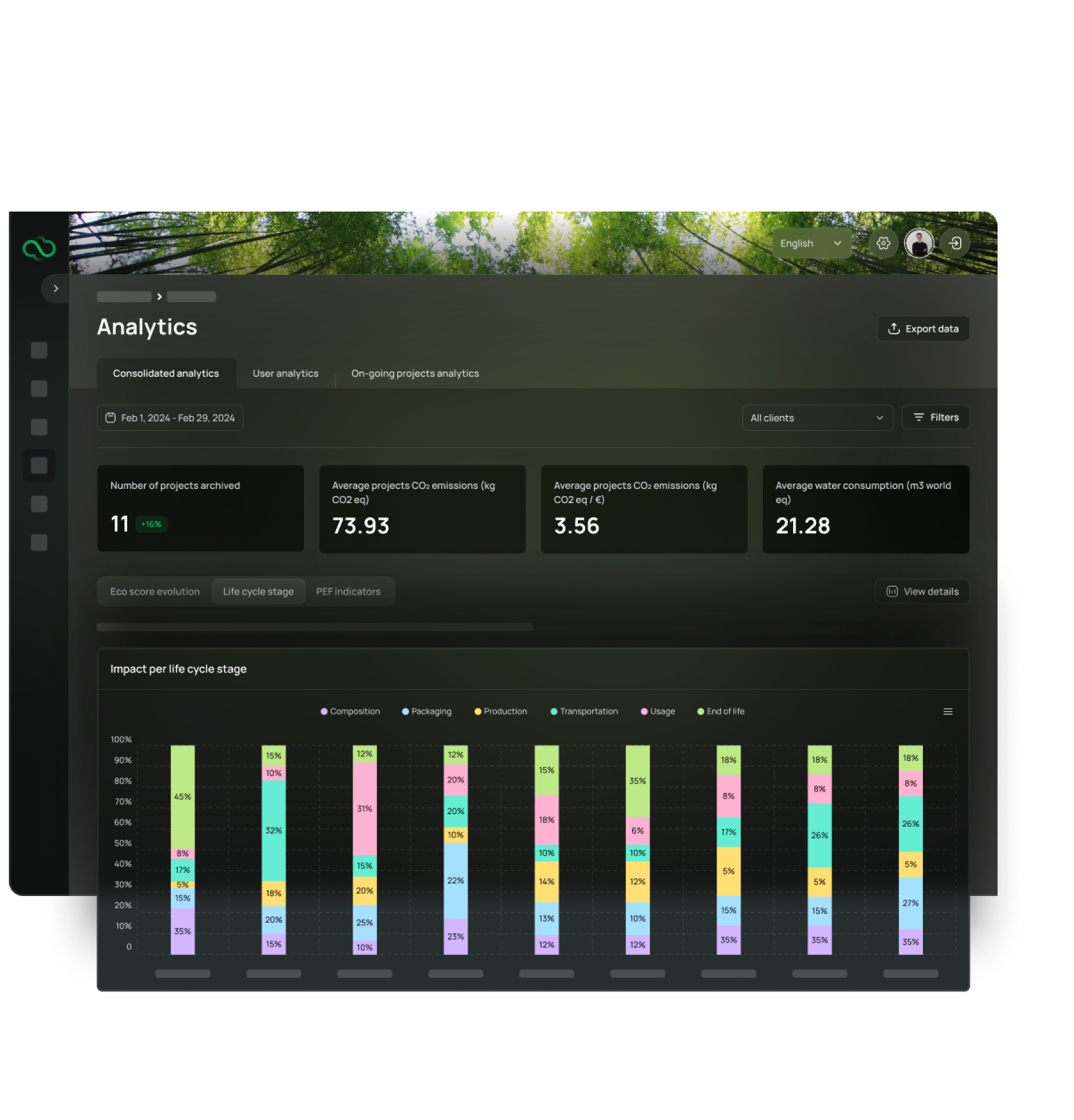 Now that you have verifiable results on the environmental impacts of each of your product, you can calculate the total footprints of your company. View and manage your sustainability performance by using your integrated Analytics with filters by: