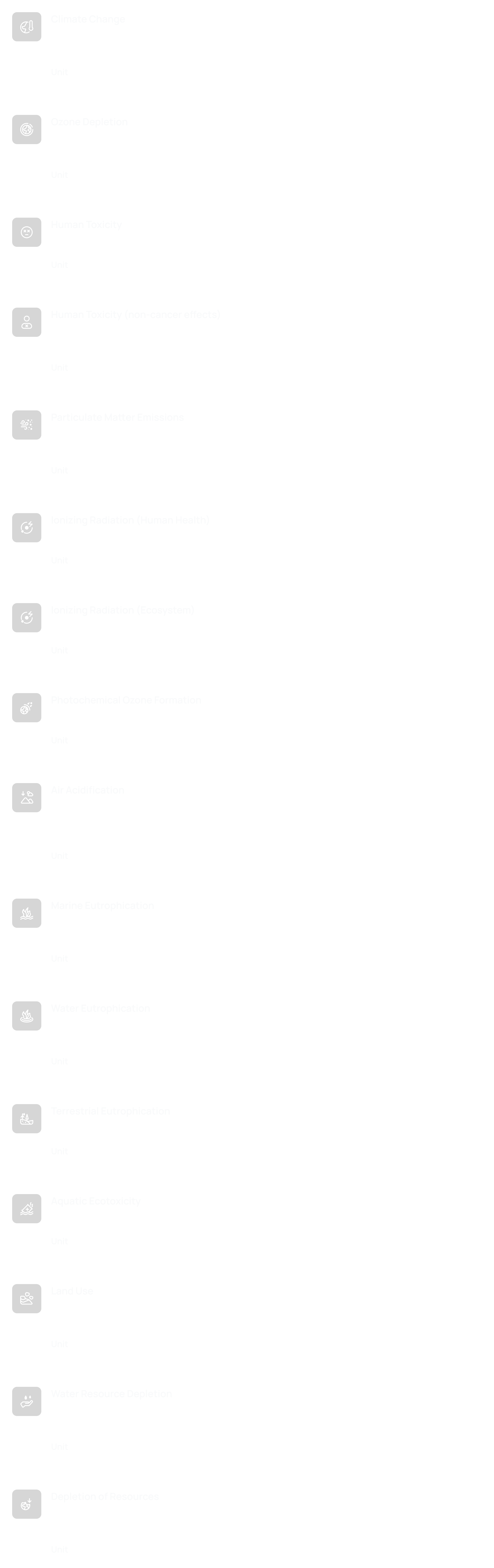 According to the European Commission's PEF standard on environmental labeling, we analysize at product-level and provide measurements for 16 impact categories.